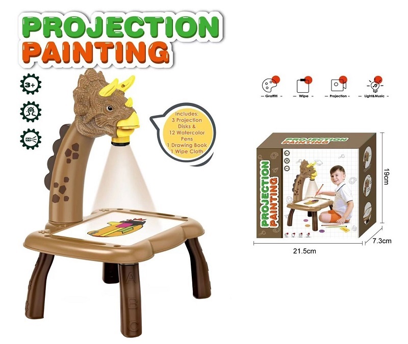 Столик развив. арт. 317 "Динозавр" в кор.)Выполнено приспособление в виде детской настольной лампы, прикрепленной к пластиковому столику на небольших ножках. Лампа имитирует голову динозавра и проецирует на столик свет. Игрушка комплектуется тремя слайдами, каждый из которых предлагает восемь разных рисунков. Все картинки проецируются на доску. Ребенку необходимо обвести и раскрасить понравившееся изображение с помощью имеющихся в комплекте фломастеров на водяной основе либо собственных карандашей. Можно рисовать прямо на самом столике, либо положить на него бумагу.
