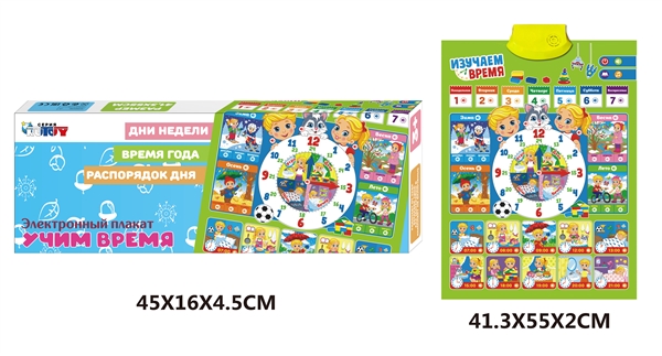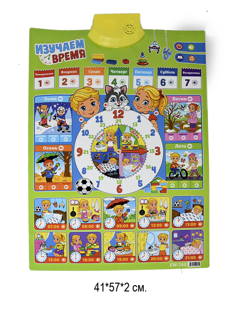 Плакат обуч. арт. KD260A" Время на бат. в кор. 45*16*4,5•/60шт.//бл.30/Умная игрушка развлечёт малыша поучительными песенками и стихами, а также поможет запомнить всю важную информацию. Плакат воспроизводит: рассказы о месяцах, весёлые песенки, стишки про времена года, забавные фразы героев.