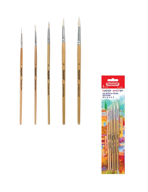 кс_Кисти арт. 200887 ПИФАГОР, набор 5 шт. (КОЗА: круглые № 1, 2, 3, 4, 5), блистер с европодвесомКол-во кистей в наборе: 5 шт.