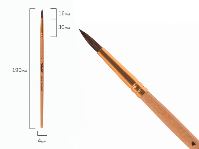 Кисть из волоса белки отлично впитывает и отдает краску, хорошо держит форму, долговечна и надежна. Кисть № 4 позволит прорисовывать мелкие детали. Деревянную лакированную рукоятку кисти удобно держать в руке. Ворс: белка. Тип кисти: круглая. Производитель: Китай.