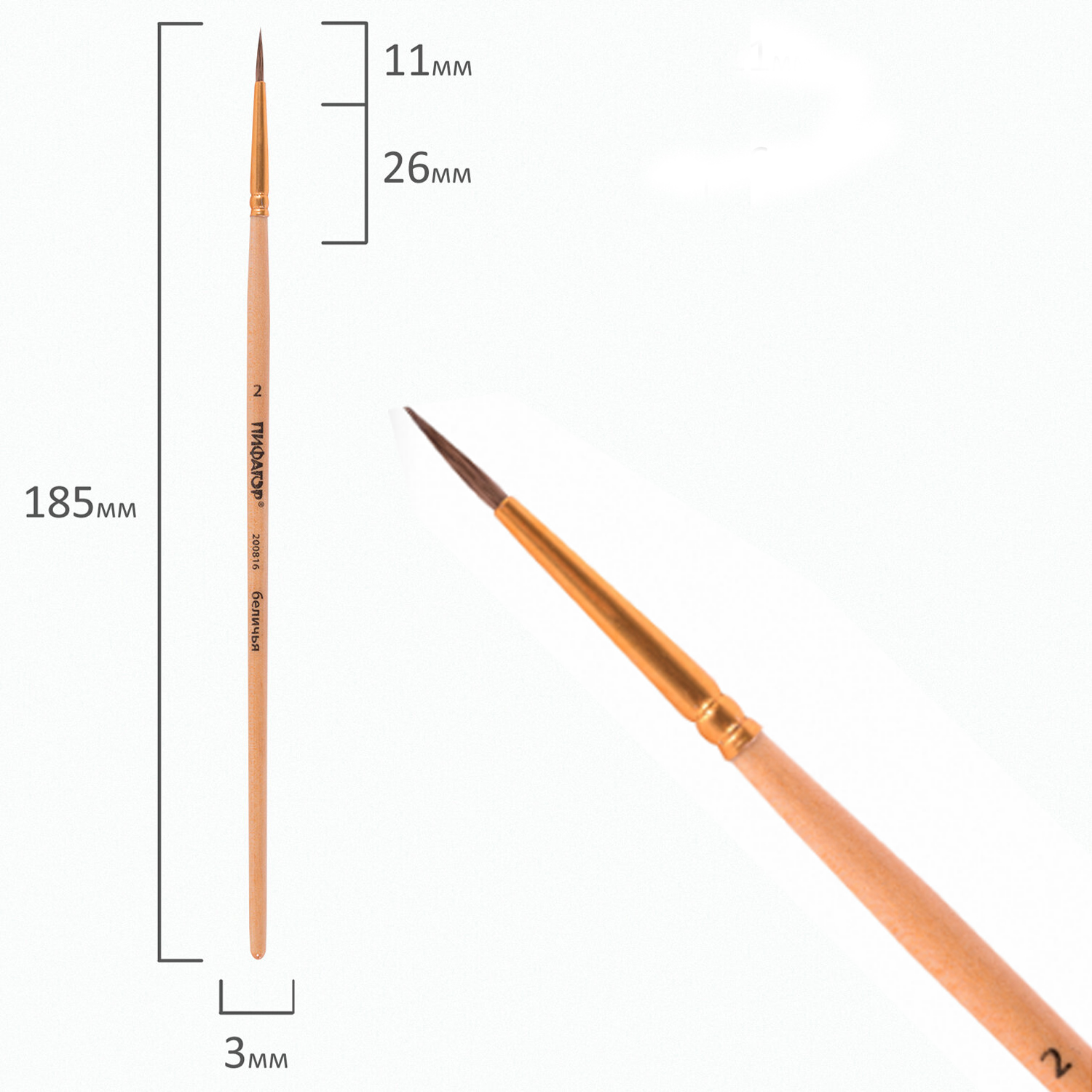 кс_Кисть арт. 200816 ПИФАГОР, БЕЛКА, круглая, № 2, деревянная лакированная ручка, с колпачкомКисть из волоса белки отлично впитывает и отдает краску, хорошо держит форму, долговечна и надежна. Кисть № 2 позволит комфортно прорисовывать мелкие детали. Деревянную лакированную рукоятку кисти удобно держать в руке.