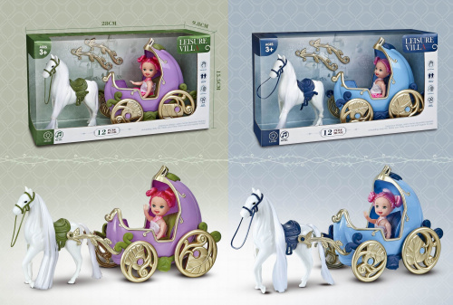 Карета арт. 686-849 С куклой, лошадью на бат. свет, звук в кор. 28*9,5*15,5У лошадки съемные аксессуары: уздечка и седло.