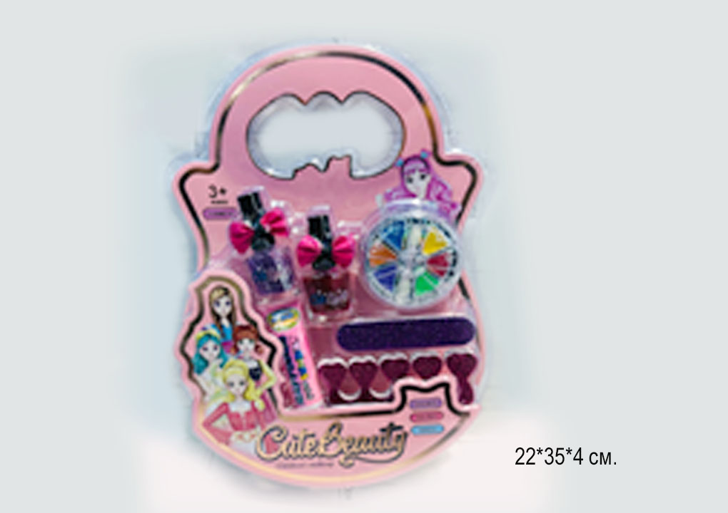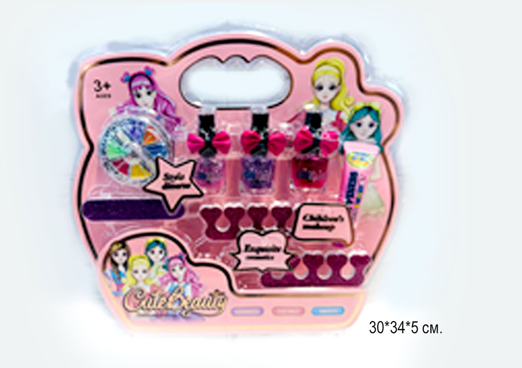 В набор входят: румяна, тени, лаки для ногтей, помады, кисточки, пилочка, разделитель для пальчиков, накладные ногти, наклейки.