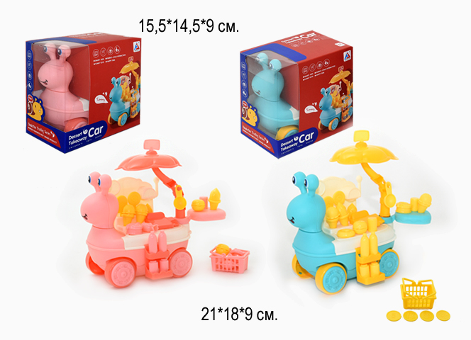 Минимаркет арт. 181A HJ Сладости 8 предметов в кор. 15,5*9*14,5Яркий игровой магазин сладостей из 28 предметов - отличный подарок и для мальчика, и для девочки! Тележка с вкусняшками создаст атмосферу настоящего магазина сладостей у вас дома! В игровой набор входит игрушечная тележка в виде очаровательной улитки, большой выбор игрушечных продуктов, касса, корзинка для покупок а также игрушечные монеты.