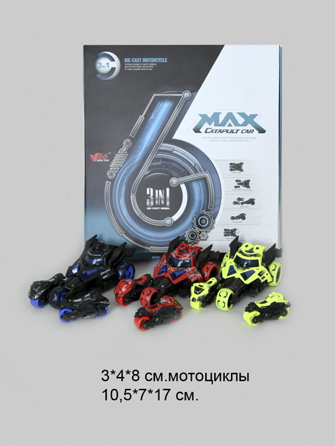 Машина инерц. арт. MY66-M2222 Запуск 2 мотоцикла (6 шт.) шоубокс•Инерционный гоночный автомобиль с пусковым устройством. Главной особенностью являются мотоциклы, которые крепятся к корпусу машинки. Ими можно выстреливать вперед, нажимая соответствующие механические кнопки.